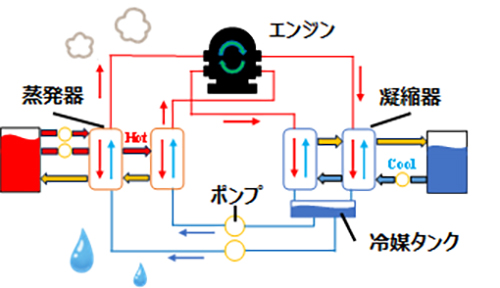 システムに使用するエンジン、発電タービン作動冷媒などの選定を行い熱交換器の性能や、発電エンジンの回転数などを調査しています。