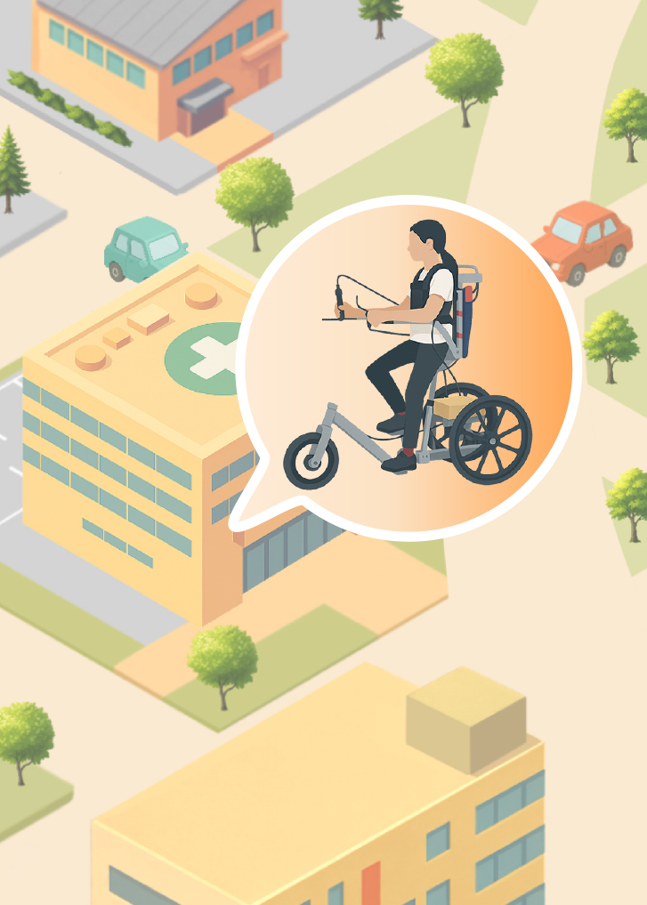 そこで、座位と立位の転換ができて任意の姿勢で利用できる、リハビリ向けの足こぎ車椅子を開発しています。